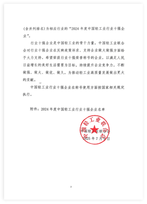 2025年7月9日,中國輕工業(yè)聯(lián)合會發(fā)布《中國輕工業(yè)行業(yè)十強企業(yè)統(tǒng)計評價結果公告》(中輕聯(lián)信統(tǒng)(2025)136號),發(fā)布了我國輕工業(yè)各行業(yè)的“2024年度中國輕工業(yè)行業(yè)十強企業(yè)”名單。